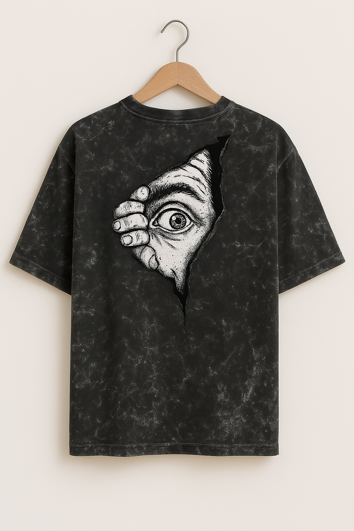 Break the barrier between reality and the surreal with the ‘Through the Void’ T-shirt from Nurox Studio. Crafted in a premium acid wash cotton blend, this oversized tee features a haunting graphic of an eye peering through a torn void — symbolizing curiosity, paranoia, and raw vision.